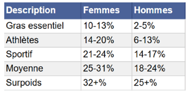 Autre point important : chercher à réduire son pourcentage de graisse n’est pas toujours une bonne idée. Certaines personnes ayant déjà un niveau de graisse compatible avec une bonne santé peuvent vouloir atteindre des catégories dites “sportives” ou “athlétiques”. Or, pour le faire, elles réduisent leur apport calorique pour perdre de la graisse, au lieu d’essayer de gagner en muscle (comme les vrais athlètes). Sur la durée, une masse grasse insuffisante peut avoir des conséquences réelles : baisse d’énergie, fatigue, sensibilité au froid, perturbations hormonales, récupération plus lente, fragilité osseuse, voire complications plus graves dans les cas extrêmes.