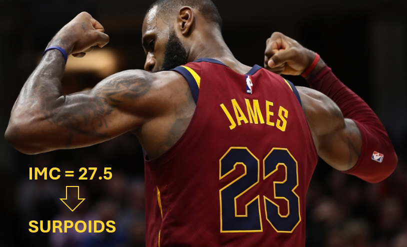 C’est ce qui explique pourquoi certaines personnes très musclées, notamment chez les sportifs, peuvent être classées en surpoids ou en obésité selon l’IMC, alors qu’elles n’ont pas d’excès de graisse. Plusieurs travaux ont d’ailleurs montré qu’une part importante d’athlètes entre dans ces catégories selon cet indicateur, alors même que leur profil corporel est loin de correspondre à l’image habituelle de l’obésité. Une étude sur +600 athlètes a montré que 25% parmi eux seraient faussement classés en surpoids ou en obésité selon l’IMC : même LeBron James serait classé en surpoids (limite d’obésité).